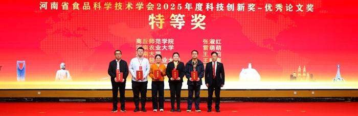 技术进步奖一等奖获奖代表王莹、程爽等同志;优秀论文一等奖获奖代表梁淇雅、吴鹏宇等15人,在台上接受了河南省食品科学技术学会副理事长,河南省农业科学院农产品加工研究中心所长万景瑞研究员;河南牧业经济学院科技处处长潘春梅教授颁奖。