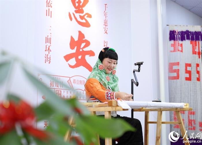 在惠安县崇武镇的锦瑶惠女坊,一盏补光灯、一台手机便是蒋碧红的“传播阵地”。方寸小店的直播间屏幕前,蒋碧红一边绣着惠女服饰上标志性的“平针绣”,一边对着镜头轻声讲解:“大家看这针脚,得跟着图案的弧度走,密一点才更灵动。”