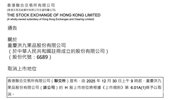 香港联交所宣布,从12月30日上午9点起,取消洪九果品的H股上市地位。