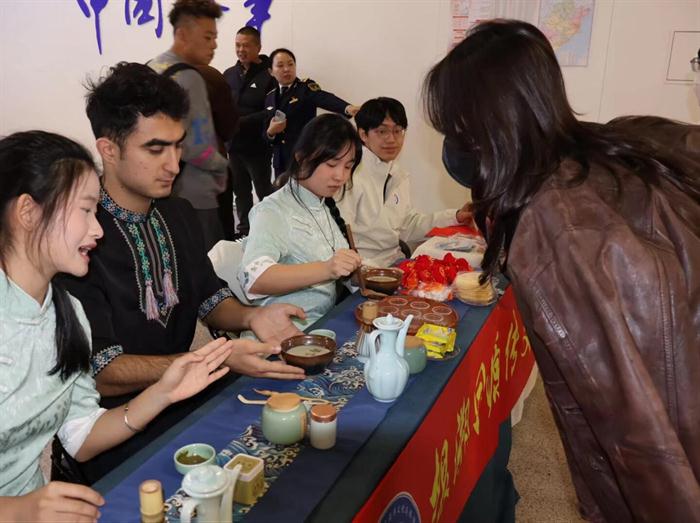 活动现场,实践队成员主动邀请厦金“小三通”乘客参与各类特色互动体验,解锁多样年俗与传统文化魅力。写春联区域,笔墨纸砚整齐摆放,乘客们纷纷提笔,在实践队成员的指导下,书写寓意美好的春联与福字,一笔一划间,承载着对马年的期许与对家国的祝福;宋代点茶体验区人气颇旺,实践队成员细致讲解点茶技艺,手把手指导乘客拂茶、击拂,看着茶汤泛起细腻的乳花,大家沉浸式感受传统茶文化的雅致,随后一同品茶畅谈,在茶香氤氲中拉近了彼此距离。此外,现场还摆放了各类闽南传统美食糕点,蛋花酥、枕头饼、桔红糕等多种特色小吃琳琅满目,供两岸同胞免费品尝,让大家在味蕾上感受闽南风情,回味家乡味道。