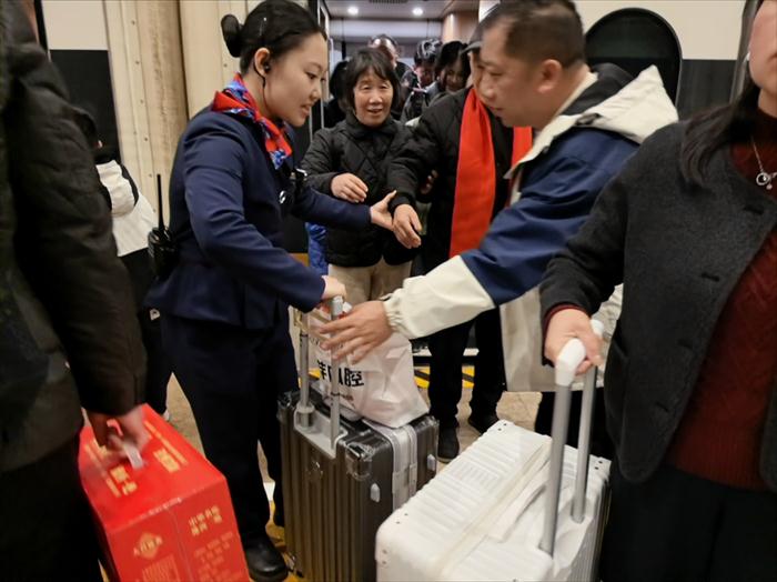 春节假期,郑州客运段高铁二队要求班组在春运中践行优质服务旅客的承诺,让旅客在返程中体验旅途的美好。西沪二组党员乘务员郭世依在车门处迎接旅客上车,她一手扶住旅客,一手提着旅客的行李。她脸上的笑容,成了春运路上最动人的温暖。韩钰茜 图