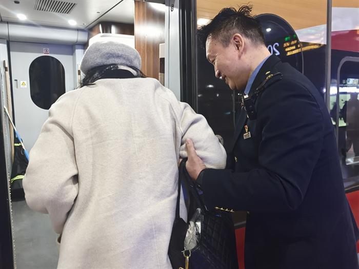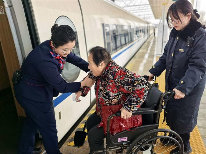 春节假期,郑州客运段高铁三队成都7组值乘G2213次列车,列车员潘淑婷在洛阳龙门立岗时,发现一名乘坐轮椅的旅客,主动上前协助,旅客对列车工作人员服务表示认可与感谢。高倩 图