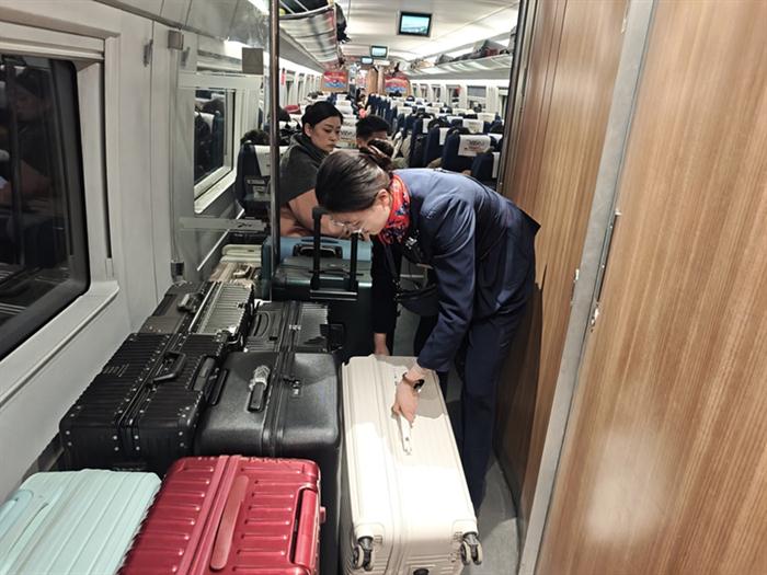 春节尾声,返程旅客剧增。郑州客运段高铁一队京西6组列车员陈薛洋在整理车厢行李箱,为旅客提供一个宽松舒畅的乘车环境。李圳懋 图