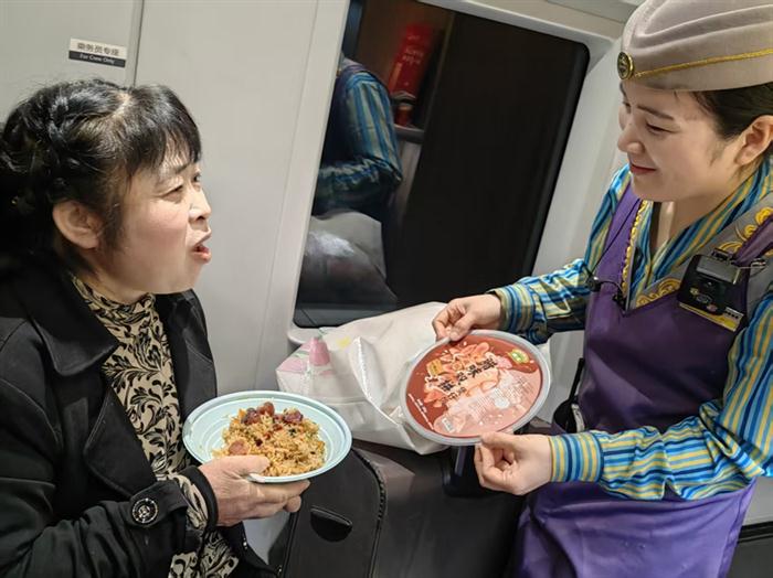 春运中,郑州客运段高铁四队秉承“匠豫”车队服务理念,用坚守诠释责任,用热忱传递温暖,全力确保节后返程运输安全,让每一位旅客体验更美好。图为餐车服务员为旅客送餐。(李新庆)