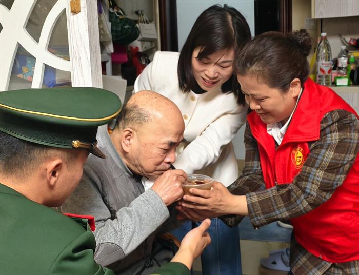 活动以上门慰问为主要形式,社区“青邻共享儿女”与各单位在职党员志愿者一同,为辖区长者送上热气腾腾、香甜醇厚的拗九粥,让老人们在传统节日里感受浓浓暖意。志愿者们重点走访慰问退伍老兵,同时悉心关怀高龄、独居、困难老人,与老兵们促膝长谈、认真倾听军旅岁月的动人故事,为他们送上节日祝福与崇高敬意,将社区的暖心关怀与尊崇之情切实送到老兵心坎上。此次活动以实际行动践行孝老爱亲、拥军优属的优良传统,坚守初心使命,让传统节日更有温度、更具力量。