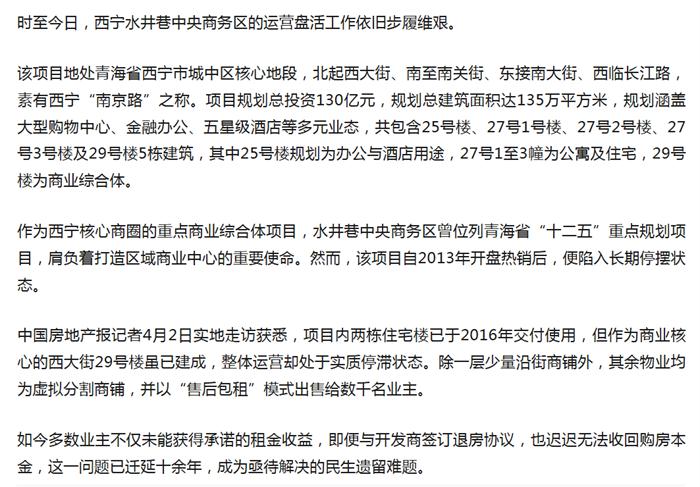 作为西宁核心商圈的重点商业综合体项目,水井巷中央商务区曾位列青海省“十二五”重点规划项目,肩负着打造区域商业中心的重要使命。然而,该项目自2013年开盘热销后,便陷入长期停摆状态。