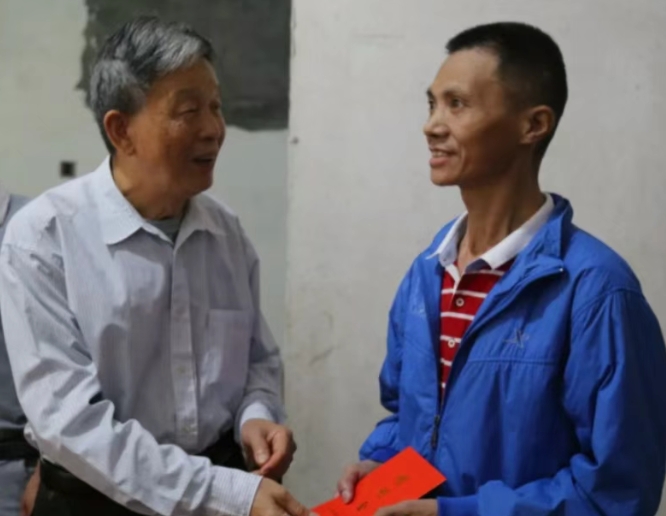 图为陈世泽(左)生前经常下基层慰问困难户。