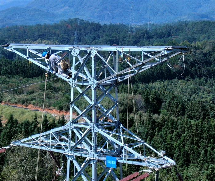 输电运维人员正在铁塔上进行T接工作 何文明摄