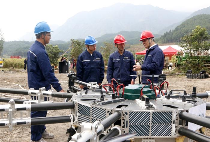 按照前线指挥部命令,国网浦城县供电公司联合南平闽延电力建设有限公司工作人员用2条60米的水带,一头连接到消防车上,一头连接到可以载重400多斤的大中型无人机上。1名队员操作无人机升空,消防车闸门打开并逐步加压。无人机慢慢飞到火场上空,一股水喷出,压制住火墙。“此次应急演练结合现场保供电应急实际操作,通过重载无人机+消防水泵精准应急灭火作业,对于传统应急设备无法到达的高远险等区域提升了应急作业的及时性、效率性等。进一步优化了“人机协同”应急预案,为森林防火及保供电提供了技术保障。”该公司生产分管负责人蔡国雄介绍。