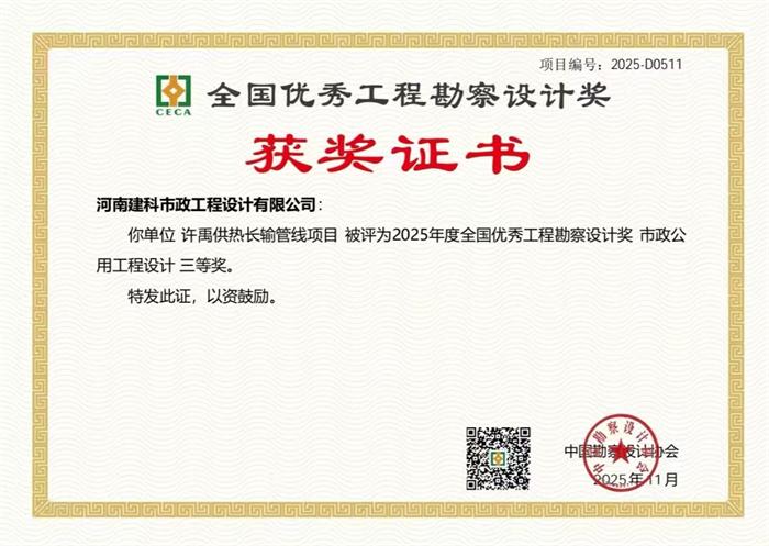 2025年11月,中国勘察设计协会正式公布2025年度全国优秀工程勘察设计奖评选结果,由河南建科市政工程设计有限公司独立承担设计的“许禹供热长输管线项目”,成功斩获市政公用工程设计三等奖。这一喜讯不仅是对该项目设计水平的权威肯定,更标志着河南省供热工程设计领域首次问鼎这一国家级行业最高荣誉,实现了河南热力工程设计从区域领先到全国认可的历史性突破。