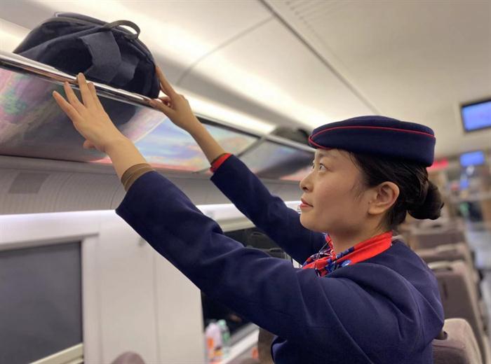 郑州客运段高铁二队列车长程雪莹在整理旅客行李箱,保持车厢整洁。路远 图