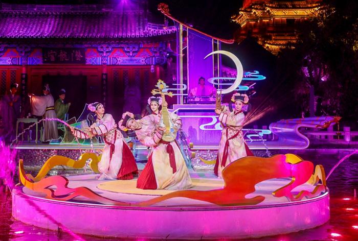 开封府景区沉浸式夜游+演艺项目依托现有资源,通过挖掘“天下首府”的历史底蕴,提炼清晰的文化脉络及核心文化价值,采用新媒体声光电、交互演绎、幻影水舞、舞美机械、艺术造景等创新形式,将历史文化、景观建筑、消费场景等进行有机融合,串联活化景区资源,打造“五大沉浸式演艺+多处拍照打卡点”的游园式情境夜游,形成虚实交互的幻戏体验,开发集故事性、艺术性和互动性等为一体的沉浸式体验定制产品,给游客带来出其不意的游玩效果与感官沉浸,让游客沿着开封府的历史脉络,穿越情境,展开一段大宋盛世的千年之旅: