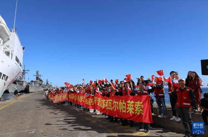 3月1日,执行“和谐使命-2025”任务的中国海军“丝路方舟”号医院船抵达智利瓦尔帕莱索港,民众在码头欢迎。新华社发(崔晓洋摄)