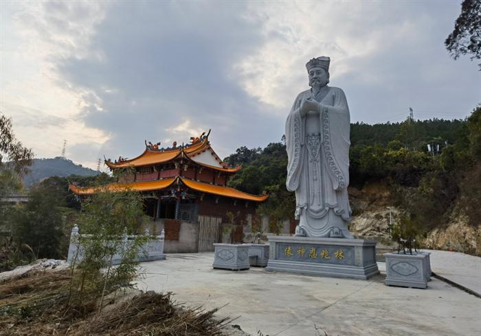先生墓静卧于青山环抱之中,背靠紫云山,面朝壶公山,松竹环绕。墓园始建于明隆庆五年,以青石混凝土筑就,呈“风”字形,龟背纹坟丘古朴厚重,石面斑驳,满是岁月沉淀。墓前石埕层叠,半月池碧水澄澈,天光云影倒映其中。墓碑篆隶字迹苍劲,镌刻着后世对先生的无尽尊崇。东侧石门寝殿古朴肃穆,殿内香火袅袅,塑像端坐,尽显先生三教合一的思想内核;不远处的先生石雕像衣袂翩然,神情温润又坚毅,目光远眺,仿佛依旧牵挂着这方水土的百姓。