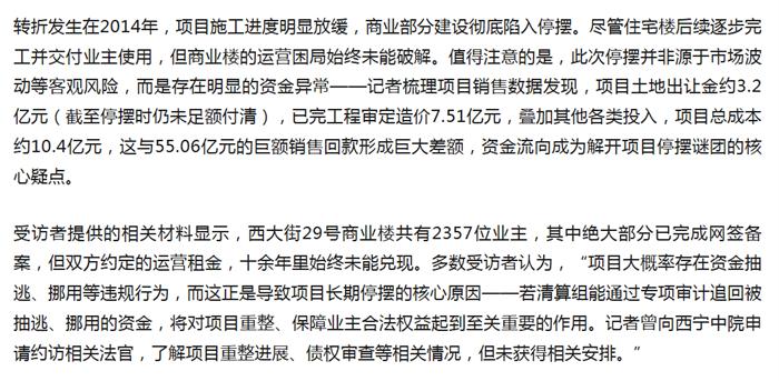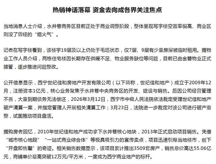 作为西宁核心商圈的重点商业综合体项目,水井巷中央商务区曾位列青海省“十二五”重点规划项目,肩负着打造区域商业中心的重要使命。然而,该项目自2013年开盘热销后,便陷入长期停摆状态。